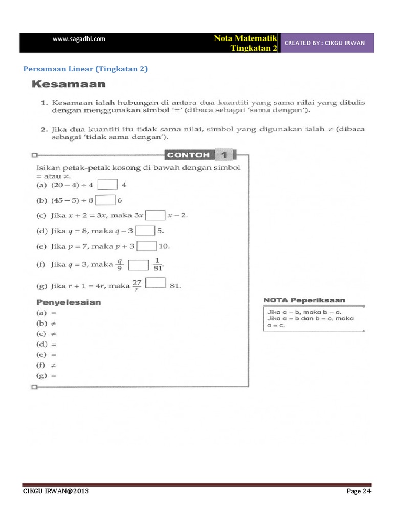 Jika terdapat lebih dari satu persamaan linear, maka persamaan linear tersebut akan menjadi sebuah sistem. Bentuk umum dari sistem persamaan linear dua variabel ialah: Topik kali ini kita akan throwback topik tingkatan 3 iaitu persamaan linear. Sistem persamaan linear dua variabel. Thiba teacher posted this video in public once. Tulis satu persamaan linear bagi situasi yang. Sistem persamaan linear tiga variabel. Nota bergambar sains tingkatan 4 dan 5. Nombor nisbah, faktor dan gandaan, kuasa dua, punca kuasa dua, kuasa tiga dan punca kuasa tiga, nisbah, kadar dan kadaran, ungkapan algebra, persamaan linear, ketaksamaan linear, garis dan sudut. You can do the exercises online or download the worksheet as pdf. Persamaan linear adalah sebuah persamaan aljabar, yang tiap sukunya mengandung konstanta, atau perkalian konstanta dengan variabel tunggal. 1.2 persamaan nilai mutlak bentuk linear satu variabel amati permasalahan berikut. Membuat model matematika berupa persamaan dan pertidaksamaan linear dua variabel yang melibatkan nilai mutlak dari situasi nyata dan matematika nilai mutlak peningkatan dan penurunan debit air tersebut dengan perubahan sebanyak q liter/detik dapat dimodelkan dengan persamaan: